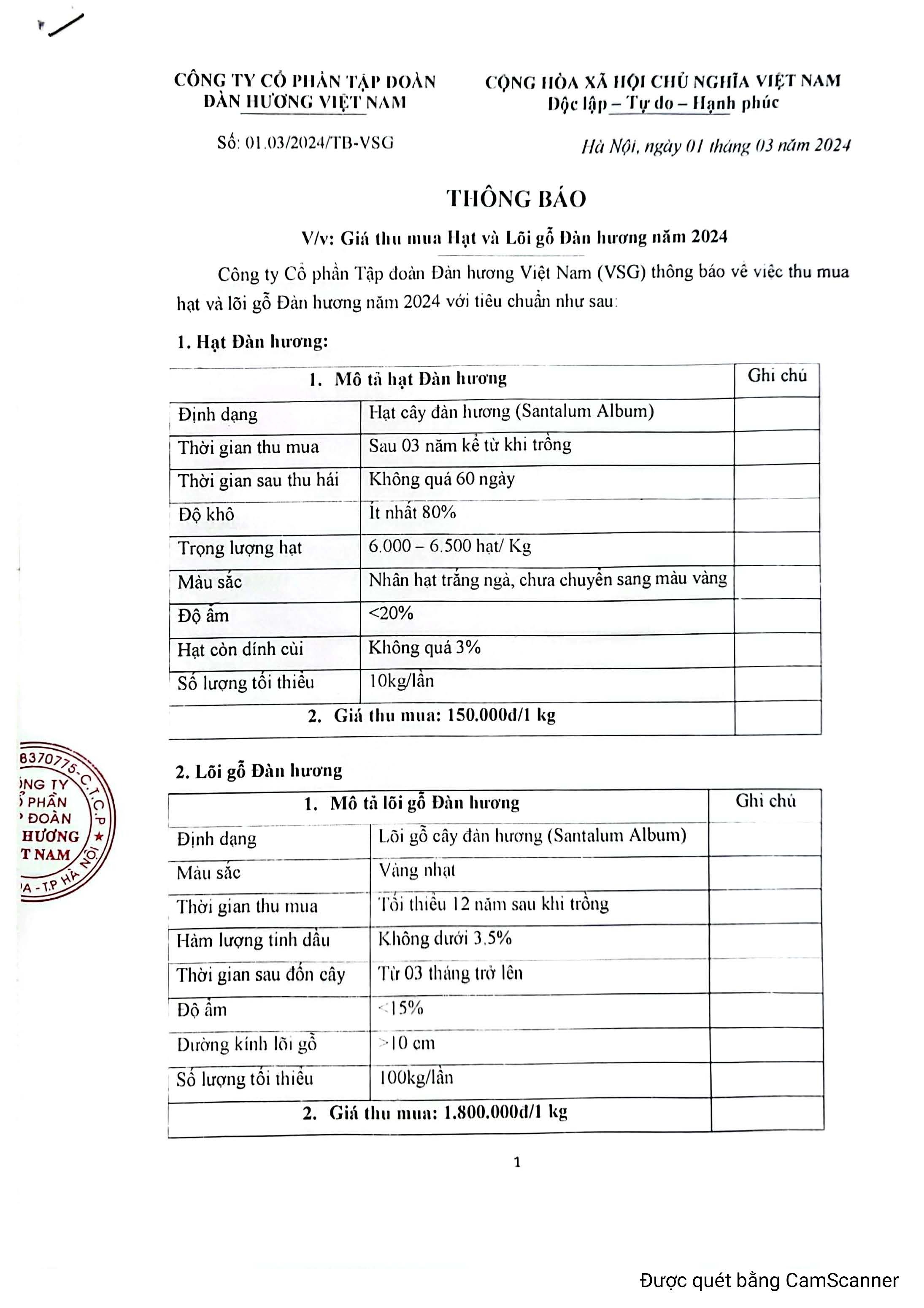 Công ty Cổ phần Tập Đoàn Đàn Hương Việt Nam (VSG) và Viện nghiên cứu cây Đàn hương và thực vật quý hiếm trân trọng thông báo chính sách giá thu mua Hạt và Lõi gỗ Đàn Hương năm 2024