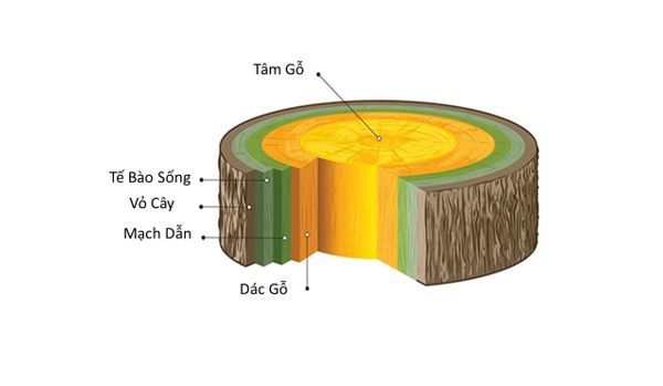 Một loài thân gỗ điển hình có hai loại gỗ; dác gỗ, bao gồm các mô sống liên quan đến việc dẫn nước và khoáng chất cho cây và lõi gỗ, phần chết của gỗ, chịu trách nhiệm về sự ổn định và sức mạnh của cây. Chính tâm gỗ cung cấp gỗ có giá trị cho chúng ta sử dụng ở giai đoạn sau.