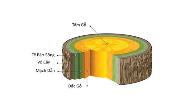 Một loài thân gỗ điển hình có hai loại gỗ; dát gỗ, bao gồm các mô sống tham gia vào quá trình dẫn nước và khoáng chất đến cây và tâm gỗ, phần gỗ chết, chịu trách nhiệm cho sự ổn định và sức mạnh của cây. Chính tâm gỗ cung cấp gỗ có giá trị cho việc sử dụng của chúng ta ở giai đoạn sau.