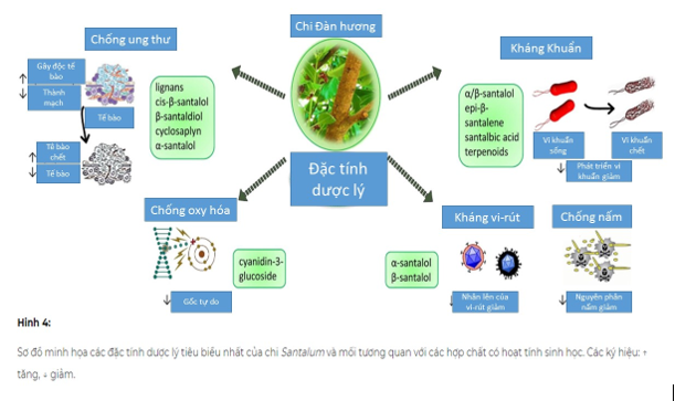 Trong hạt của Santalum album có một hợp chất được gọi là axit santalbic, có đặc tính kháng khuẩn chống lại vi khuẩn gram dương và tác dụng kháng nấm đối với nhiều loại nấm gây bệnh. Phát hiện ra rằng các phần hữu cơ thô và sesquiterpenoids từ dầu gỗ đàn hương có hoạt tính kháng khuẩn chống lại vi khuẩn Helicobacter pylori gây loét dạ dày và cũng có thể là nguyên nhân gây ung thư dạ dày. Nhằm mục đích tiến hành phân tích hóa học thực vật và sàng lọc kháng khuẩn đối với chiết xuất ether dầu hỏa và ethanol của hạt S. album . Hoạt tính kháng khuẩn in vitro của cả hai chiết xuất được phân tích bằng phương pháp khuếch tán đĩa cho Bacillus subtilis, S. aureus, Pseudomonas aeruginosa, Escherichia coli và C. albicans. Kết quả của các cuộc điều tra làm nổi bật tiềm năng hiệu quả cao của chiết xuất ether dầu mỏ liên quan đến axit santalbic, có thể hoạt động như một chất chống vi trùng.