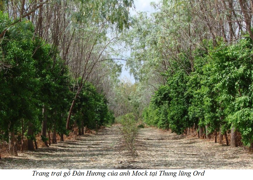 Vào năm 2000, người nông dân trồng mía Paul Mock tại thung lũng Ord, Úc đã quyết định trồng 5 ha cây đàn hương Ấn Độ trong trang trại của mình. "Bố tôi đặt trước mặt tôi một số nghiên cứu về gỗ Đàn hương Ấn Độ, một loại cây trồng mà tôi chưa từng nghe nói đến bao giờ, các con số trông có vẻ đầy hứa hẹn, mặc dù thời gian thu hoạch khá dài, 15 năm. Sau đó, chúng tôi quyết định thử trồng trên một khu vực với diện tích 5 ha."